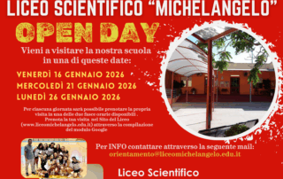 Quest’anno il Liceo Michelangelo di Cagliari presenterà la propria Offerta Formativa attraverso tre “Open Day” in presenza che si svolgeranno presso la sede Centrale in via dei Donoratico nelle date di: Venerdì 16 gennaio 2026 - Mercoledì 21 gennaio 2026 - Lunedì 26 gennaio 2026 Le prenotazione per le tre date potranno essere fatte tramite modulo online e verranno aperte l'1 dicembre 2025